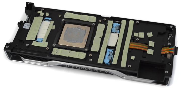 Задняя пластина тоже участвует в охлаждении. На внутренней поверхности есть несколько термопрокладок, которые обеспечивают контакт с платой в зоне под микросхемами памяти и узлом питания. Остальная поверхность покрыта диэлектрической черной пленкой. Примечательно, что одна маленькая термопрокладка (на снимке крайняя справа) наложена прямо на эту пленку, и прямого контакт с металлической поверхностью явно не обеспечивает.